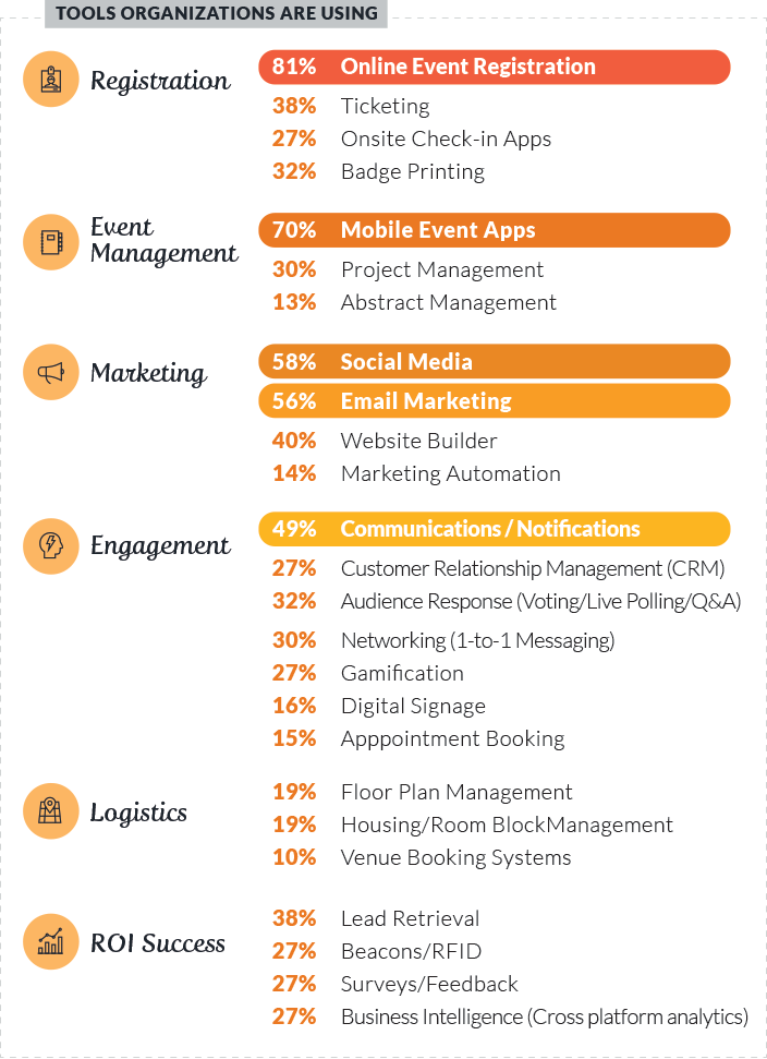 Here’s a breakdown of survey results, starting with the percentage of event planners who use each of the following types of event management software tools: